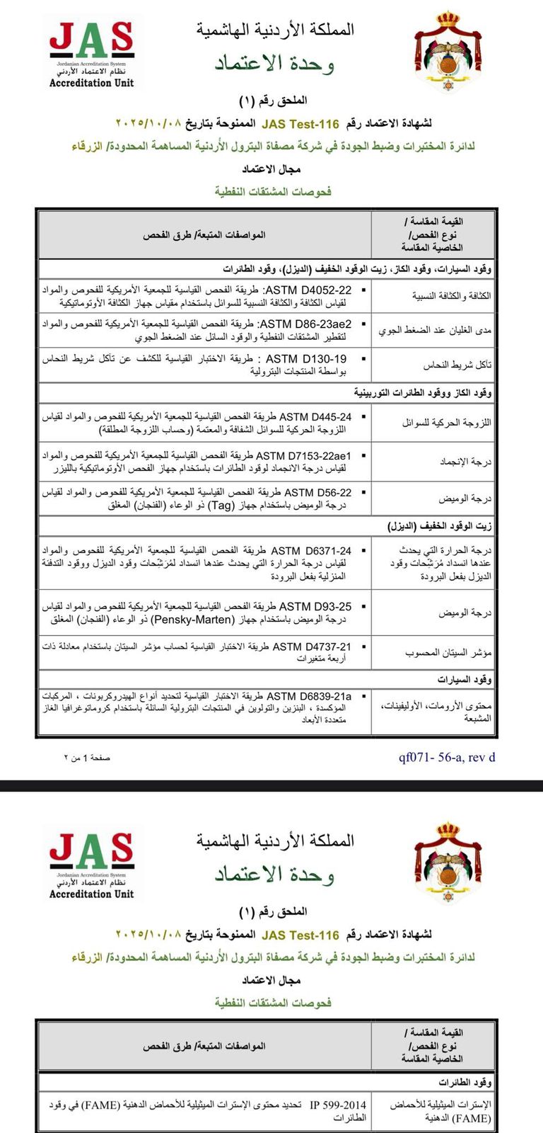 وجاء الاعتماد بعد قيام وحدة الاعتماد، نظام الاعتماد والتقييس الأردني، بالتأكد من تطبيق المختبرات لمتطلبات المواصفة الدولية الايزو/ أييسي (ISO/IEC 17025:2017) في مجال فحوصات المشتقات النفطية، وبناءً عليه فإن تقارير الفحص الصادرة عن المختبر معترف بها دوليًا ومقبولة في جميع أنحاء العالم.